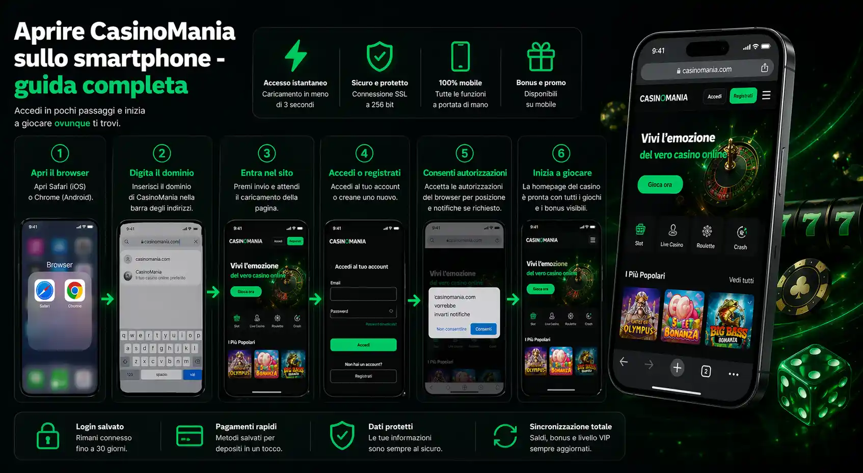 Questa guida spiega come accedere a CasinoMania su dispositivi iOS e Android, aggiungere scorciatoie alla schermata home, gestire depositi e prelievi dal telefono e navigare nel catalogo di giochi completo. I protocolli di sicurezza, le metriche di prestazione e la funzionalita dei bonus rimangono intatte nella versione mobile. Sia che si utilizzi Safari su iPhone o Chrome su Android, l'esperienza del casino nel browser rispecchia la funzionalita desktop ottimizzando per i controlli touch e gli schermi piu piccoli.